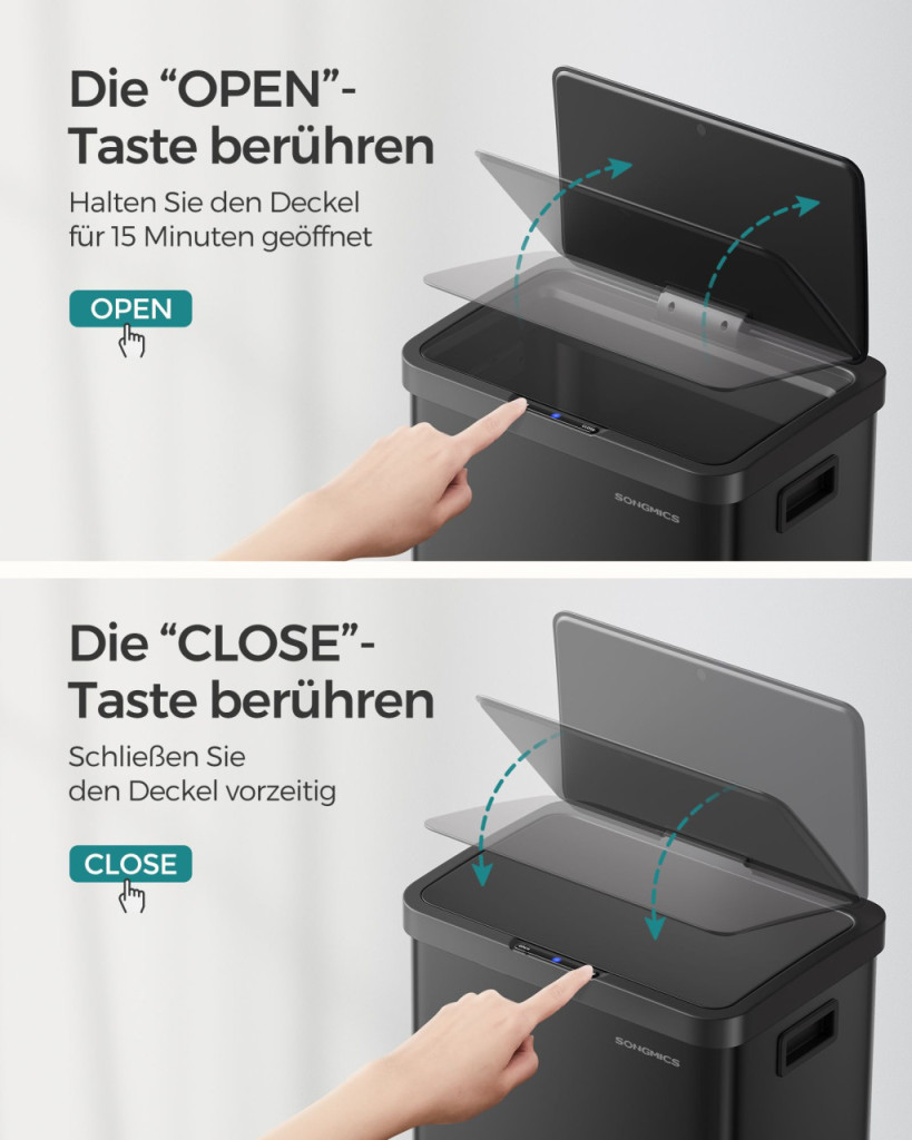 A praktikus nyitva tartás funkcióval 15 percig nyitva tartható a fedél, ami különösen hasznos főzés közben. A csomag tartalmaz 15 szemeteszsákot és egy rögzítőgyűrűt, amely biztosítja a zsák stabil tartását és esztétikus megjelenését.